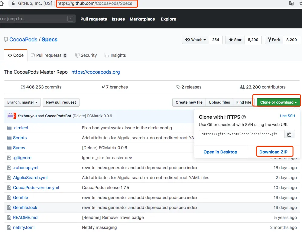 1、到github.com/CocoaPods/S…这个网址下点击clone or download->download zip(也可以用你配好的ide直接git),