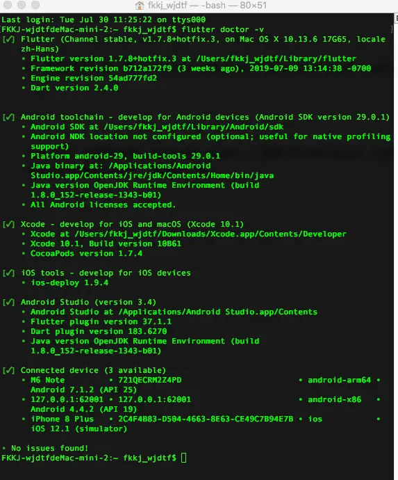 完成之后,在控制台输入命令flutter doctor -v(相对于flutter doctor,此命令结果更详细)检测flutter环境就OK啦!,我的如下图: