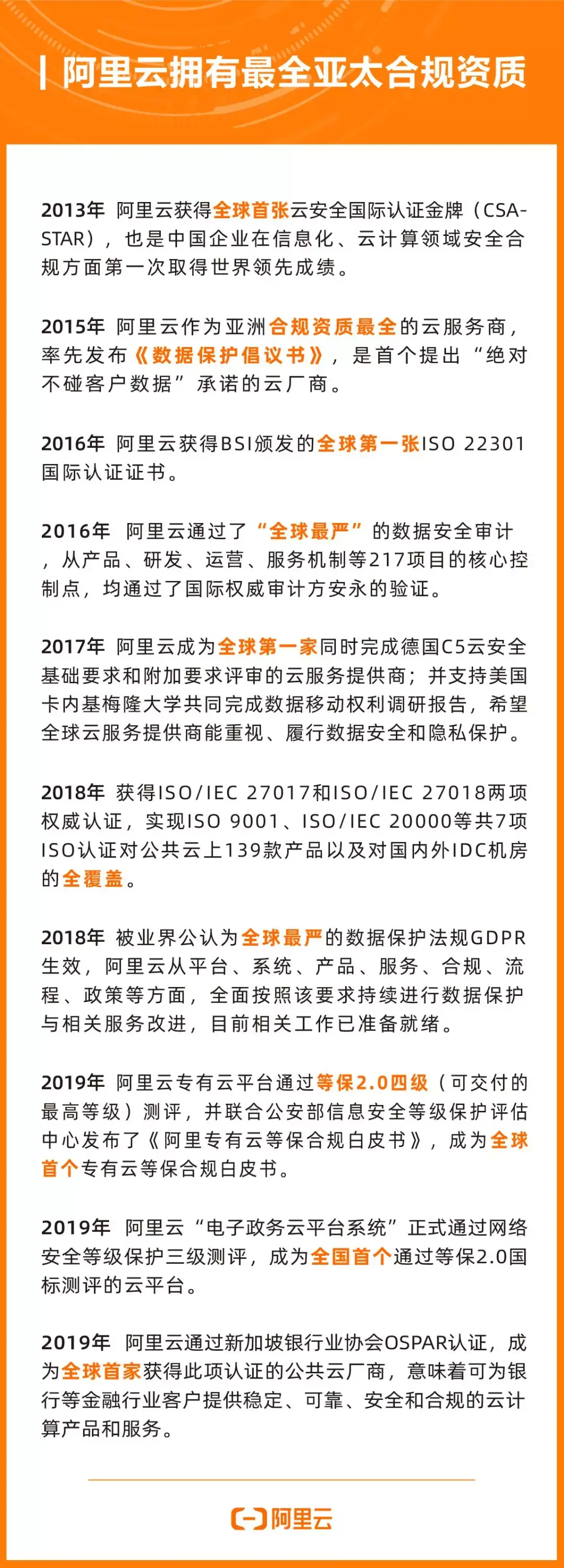 事实上不仅在国内,阿里云在亚太地区也是合规资质最全的云服务商。