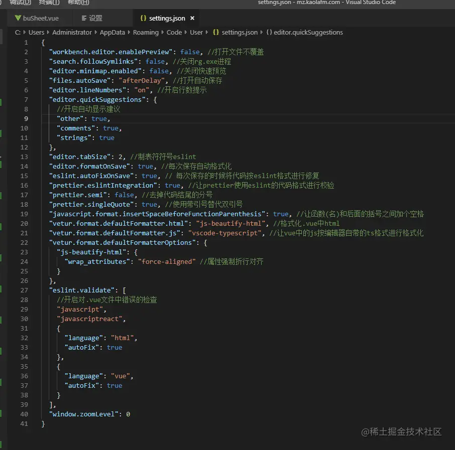 { // 保存后自动修复格式 "editor.codeActionsOnSave": { "source.fixAll.eslint": true }, //eslint "editor.formatOnType": true, "eslint.options": { //指定eslint配置文件位置 "extensions": [".js", ".vue"], "configFile": ".eslintrc.js" //指定项目根目录中的eslint配置文件 }, // vscode默认启用了根据文件类型自动设置tabsize的选项 "editor.detectIndentation": false, // 重新设定tabsize "editor.tabSize": 2, // #值设置为true时,每次保存的时候自动格式化;值设置为false时,代码格式化请按shift+alt+F "editor.formatOnSave": true, // #每次保存的时候将代码按eslint格式进行修复 "eslint.autoFixOnSave": true, // 添加 vue 支持 "eslint.validate": [ //开启对.vue文件中错误的检查 "javascript", "javascriptreact", { "language": "html", "autoFix": true }, { "language": "vue", "autoFix": true } ], "prettier.semi": false, //去掉代码结尾的分号 "prettier.singleQuote": true, //使用带引号替代双引号 // #让prettier使用eslint的代码格式进行校验 "prettier.eslintIntegration": true, "prettier.tabWidth": 2, // #让函数(名)和后面的括号之间加个空格 "javascript.format.insertSpaceBeforeFunctionParenthesis": true, // #这个按用户自身习惯选择 // 选择 vue 文件中 template 的格式化工具 "vetur.format.defaultFormatter.html": "js-beautify-html", "vetur.experimental.templateInterpolationService": true, // vetur 的自定义设置 "vetur.format.defaultFormatterOptions": { "js-beautify-html": { // #vue组件中html代码格式化样式 "wrap_attributes": "auto", //也可以设置为“force-aligned”,效果会不一样 "wrap_line_length": 160, "end_with_newline": false, "semi": false, "singleQuote": true }, "prettier": { "semi": false, // 格式化不加分号 "singleQuote": true // 格式化以单引号为主 } }, "vetur.format.defaultFormatter.js": "vscode-typescript", "[jsonc]": { "editor.defaultFormatter": "esbenp.prettier-vscode" }, "prettier.useTabs": true, "files.autoSave": "off", "explorer.confirmDelete": false, "[json]": { "editor.defaultFormatter": "esbenp.prettier-vscode" }, "diffEditor.ignoreTrimWhitespace": false, "[vue]": { "editor.defaultFormatter": "octref.vetur" } // 两个选择器中是否换行 }