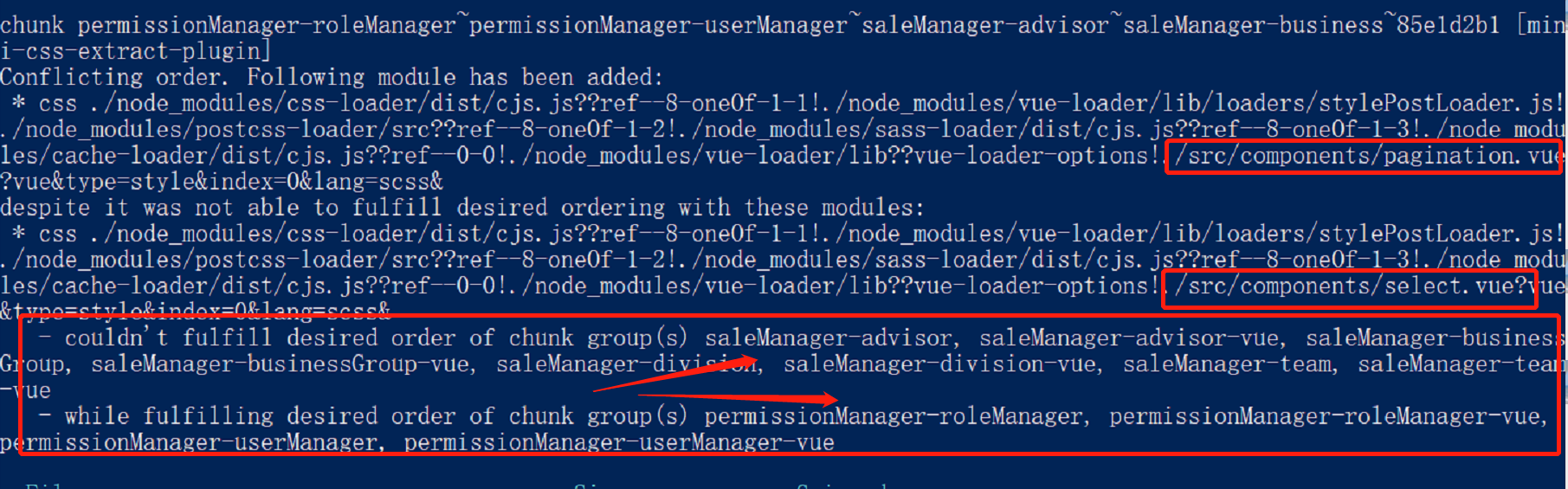 刚刚看到这些提示信息,一头雾水,测试了打包好的文件,发现功能正常,但是,本人比较钻牛角尖,不允许有一点警告或者提示信息,通过仔细观察,图片中的红色标起来的地方:pagination组件和select组件的。感觉应该是这两个文件的问题,在接着往后看,看最下面的红色圈起来的地方:原来是他们希望chunk要按照顺序引入,即所有的组件里面最好都要按照相同的顺序来引入这两个组件,比如,在其中一个组件先引入select,再引入pagination组件,另外一个组件最好不要先引入pagination,再引入select。