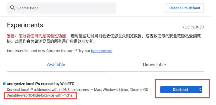 #enable-webrtc-hide-local-ips-with-mdns该配置 并将属性改为disabled