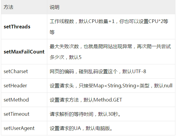 在上面的演示程序中,我们使用了submit()方法进行提交任务,默认是使用了Jsoup+上面的那些非加粗属性进行爬取,一般情况下够用,如果要一个一个的扩展Jsoup的方法太累了,于是我想到把爬虫方法提供给用户重,让用户自己去扩展,想用什么爬,想设置什么属性都可以。