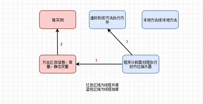 - 程序计数器: 程序计数器是一块较小的内存空间,它可以看作是当前线程所执行的字节码的方位指示器,字节码指示器工作时是通过改变计数器的值来选取下一条需要执行的字节码指令,分支,循环,跳转,异常处理,线程恢复等线程的基础功能都需要依赖这个程序计数器。且由于java虚拟机的多线程是通过多个线程轮流切换并分配处理器执行时间的方式来实现的,在某一时间,一个处理器只会处理一条线程,为了就是执行时间到了之后恢复到正确的执行位置,每个线程都有独立的程序计数器,各线程间运行互不影响,独立存储,我们称之为线程独有的内存。