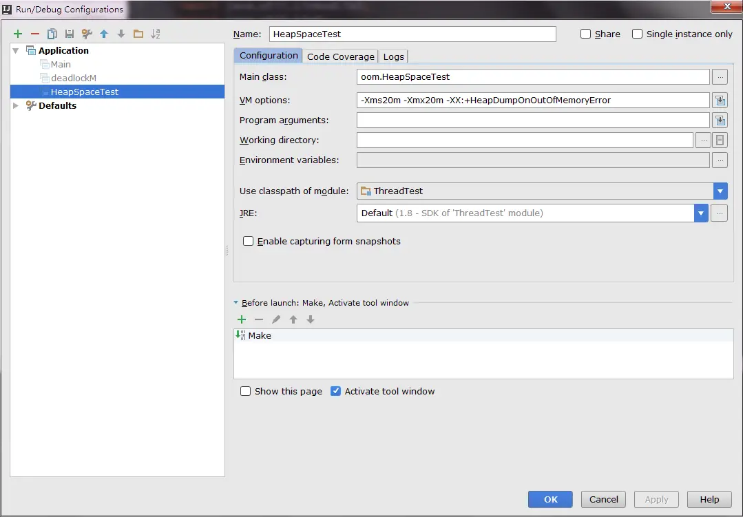 tips:-Xms20m -Xmx20m -XX:+HeapDumpOnOutOfMemoryError