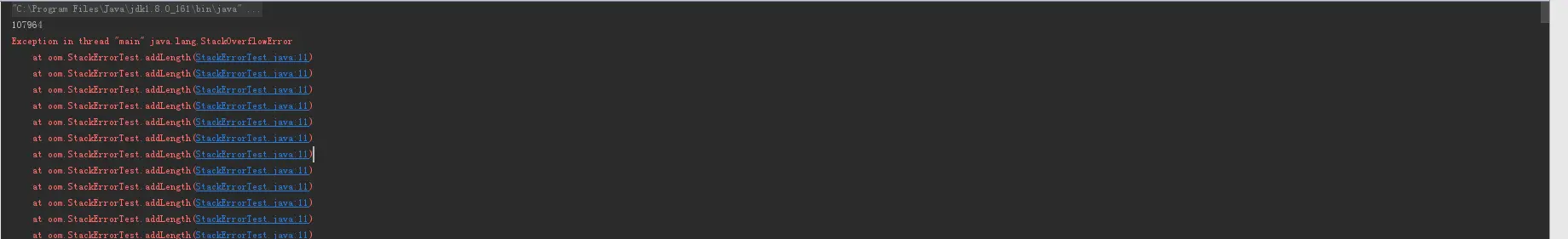 所以可以看出当栈内存不足或者本地变量大于内存时,会抛出StackOverFlowError。