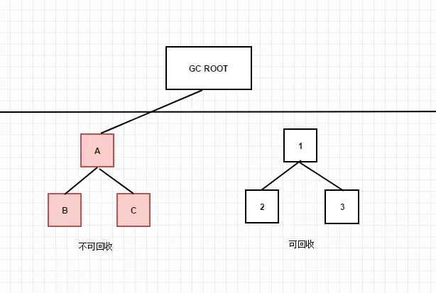 - GC ROOT可达性算法:我先来讲讲GC ROOT代表的是什么意思。其实他并不是虚拟机中的一种工作机制,而是将一些区域(某些类引用的地方)成为起始点,也就是GC ROOT的概念了。起始点大概概括为:虚拟机栈中引用的对象(方法里面的对象引用),方法区中类静态属性引用的对象(方法区中可是存在类信息,静态遍历和常量),方法区中常量引用的对象(即是类变量里的静态和常量引用的对象)。GC ROOT判定对象存活状态如下图,如果实例被GC ROOT引用那就是可存活,但是如果没有被引用那么就是可回收。缺点应该显而易见,在查询某对象是否应该被回收时他要去追踪是否被GC ROOT引用,效率要比前者低。