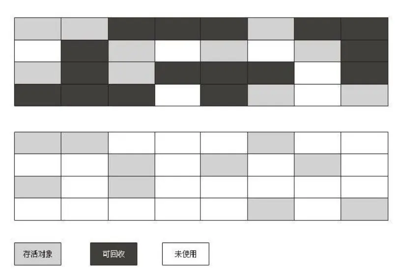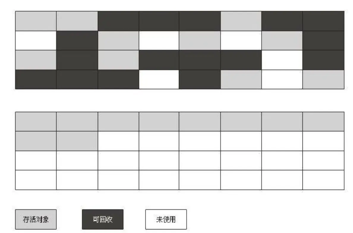 这个算法算是比较基础了,后面的几种算法也是根据该算法改进的。理解名字就知道该算法是通过标记需要回收的对象,在标记完成后统一进行清除的基础算法,该算法不足的地方有两个:最显而易见的是清除之后产生的许多不连续的内存碎片,当后续需要分配内存较大的对象时,内存不能做到物以致用。二就是效率的问题,标记和清除的效率都不高。