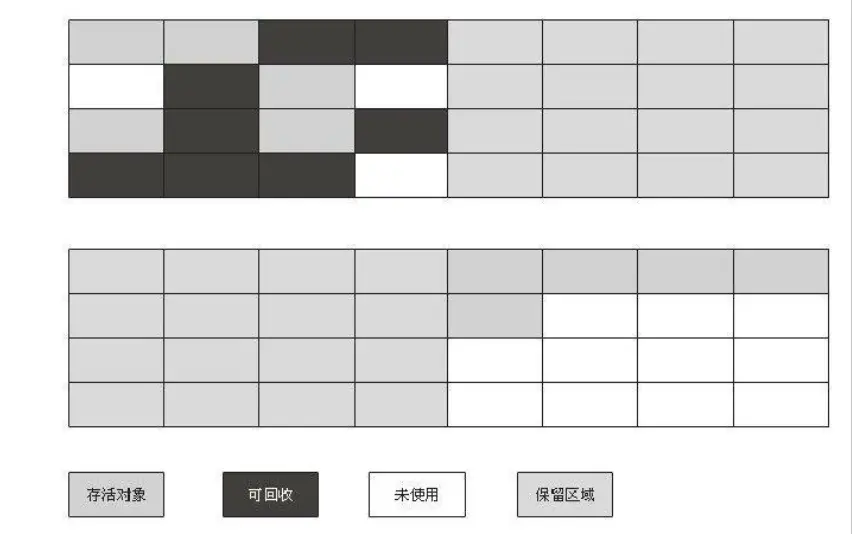 标记-整理算法:和基础的标记-删除算法理念相同,只不过在标记完成后,不是直接对可回收对象进行直接的回收,而是把存活的对象都向一端移动,移动完成后,然后就清除其他边界外的内存。解决了内存碎片的问题。