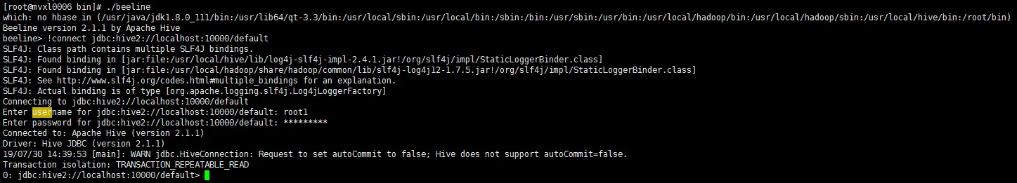 配置完后重启HiveServer2,再通过./beeline($HIVE_HOME/bin下)测试连接
