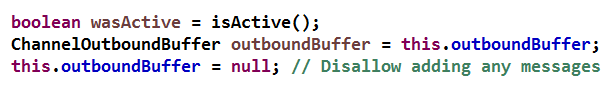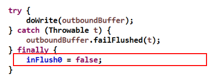 如果非常不幸,再次发送仍然没有把积压的消息全部发送完毕,再次发生了写半包,那无论是否有积压消息,执行 AbstractUnsafe.close 的 Task 还是会把链路给关闭掉,原因是只要完成一次消息发送操作,Netty 就会把 inFlush0 置为 false,代码如下: