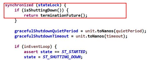 解释下为什么要加锁,因为 shutdownGracefully 是 public 的方法,任何能够获取到 NioEventLoop 的代码都可以调用它,在 Netty 中,业务代码通常不需要直接获取 NioEventLoop 并操作它,但是 Netty 对 NioEventLoop 做了比较厚的封装,它不仅仅只能读写消息,还能够执行定时任务,并作为线程池执行用户自定义 Task。因此在 Channel 中将获取 NioEventLoop 的方法开放了出来,这就意味着用户只要能够获取到 Channel,理论上就会存在并发执行 shutdownGracefully 的可能,因此在优雅退出的时候做了并发保护。