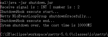 class ShutdownHook implements Runnable{ @Override public void run() { System.out.println("ShutdownHook execute start..."); System.out.print("Netty NioEventLoopGroup shutdownGracefully..."); try { TimeUnit.SECONDS.sleep(10);// 模拟应用进程退出前的处理操作 } catch (InterruptedException e) { e.printStackTrace(); } System.out.println("ShutdownHook execute end..."); System.out.println("Sytem shutdown over, the cost time is 10000MS"); }}