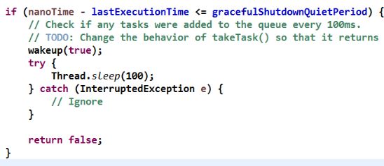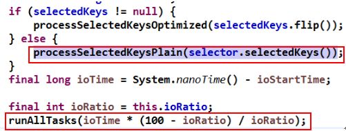 1.为了防止定时任务 Task 或者用户自定义的线程 Task 的执行过多占用 NioEventLoop 线程的调度资源,Netty 对 NioEventLoop 线程 I/O 操作和非 I/O 操作时间做了比例限制,即限制非 I/O 操作的执行时间,如上图红框中代码所示。有了执行时间限制,因此可能会导致已经到期的定时任务、普通任务没有执行完,需要等待下次 Selector 轮询继续执行。在线程退出之前,需要对本该执行但是没有执行完成的 Task 进行扫尾处理,所以在 confirmShutdown 中再次调用了 runAllTasks 方法;