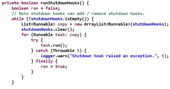 虚拟机退出时,底层会自动检测用户是否注册了 ShutdownHook 任务,如果有,则会自动将 ShutdownHook 线程拉起,执行它的 Run 方法,用户只需要在 ShutdownHook 中执行资源释放操作即可,示例代码如下: