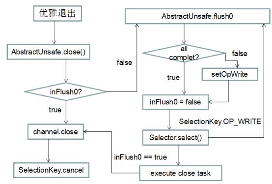 实际是无法保证的,它只能保证如果现在正在发送消息过程中,调用了优雅退出方法,此时不会关闭链路,继续发送,如果发送操作完成,无论是否还有消息尚未发送出去,在下一轮 Selector 的轮询中,链路将会关闭,没有发送完成的消息将会被丢弃,甚至是半包消息。它的处理原理图如下: