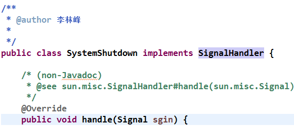 其中 shutdownHandler 实现了 SignalHandler 接口的 handle(Signal sgin) 方法,代码示例如下: