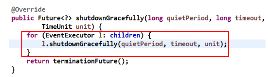NioEventLoopGroup 实际是 NioEventLoop 的线程组,它的优雅退出比较简单,直接遍历 EventLoop 数组,循环调用它们的 shutdownGracefully 方法,源码如下: