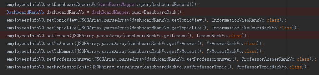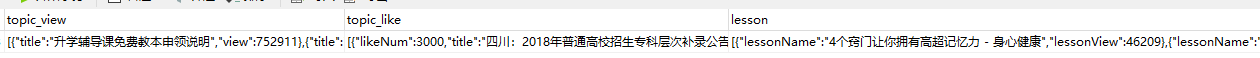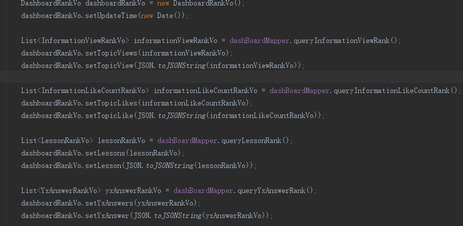 所以这里需要将数据进行一次Json字符串的转换,用到的方法为JSON.toJSONString(List对象),将数据从表中以Json格式取出来同理,用到的方法是JSONArray.parseArray(dashboardRankVo.getTopicView(), InformationViewRankVo.class);