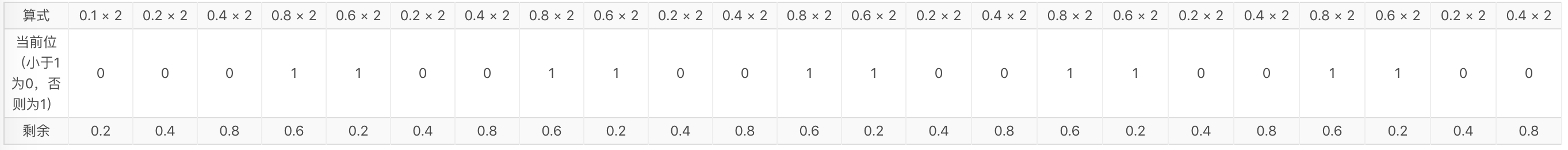 将一个小数转为二进制的方法跟整数类似,只不过除法要换成乘法:1. 该整数乘以 2 得到积,如果大于等于 1,则二进制位为 1,否则为 0;2. 若积大于等于 1,则减去 1,新的数继续重复步骤 1,否则原来的积继续重复步骤1。