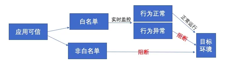 应用可信的实现可通过只允许指定的应用,即所谓白名单应用在某个环境下(一般是物理主机、虚拟机上或容器)运行,非白名单应用无法在目标环境中运行;同时白名单应用受到监控,其运行行为一旦被发现异常,系统会根据异常行为的安全危害等级报警并采取相应措施,如阻断应用、删除应用、重启系统等。对环境中运行的应用进行限制可减少不安全的应用对云平台进行攻击的可能性,而对应用的监控可以及时发现攻击并做响应。