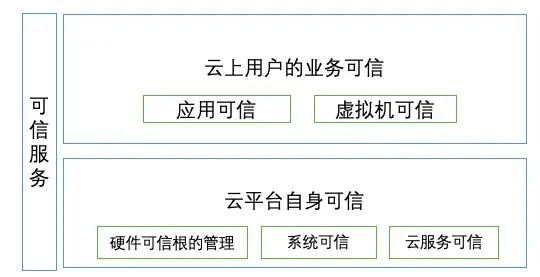 云平台可信即确保云平台上运行的系统软件,如固件、操作系统(OS)都是安全的,保障平台上的系统不被篡改,即保持运行环境是所要求的运行环境。为实现这个目标,主要采用的手段是对系统软件的度量和验证,而度量和验证自身的可信通过云平台可信硬件来支持。可信硬件作为云服务器或接入用户服务器的可信根,通过在硬件内部实现最基础的安全功能如秘钥存储、安全算法实现从下到上逐级的可信链传递。