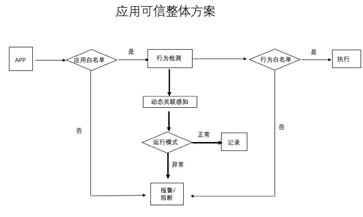动态度量和验证采用的是通过应用行为白名单来实现的。被度量和验证的应用行为是系统调用行为,包括进程启动、进程调用、网络访问、文件访问等。系统调用是应用的核心执行动作,一个被攻击过、不再可信的应用在执行实现攻击者目标时必须通过系统调用实现,也就是说,通过对系统调用的监测能够有效地发现应用异常,即不再可信。实现应用可信的具体方式是首先通过对白名单应用的分析,收集用户正常行为,并以此建立行为规则库,然后根据实时采集的应用行为数据,对比应用行为规则库进行判断。如果应用行为无法匹配任何一条规则,这个行为会被判断为异常,可信云决定是否告警或终止应用运行。