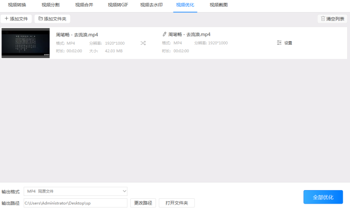 6、点击“优化”/“全部优化”按钮按照设置的参数进行视频优化。优化时会有一个蓝色进度条出现,当进度条到达100%时就表示视频已经优化好了。接下来只要点击覆盖在“优化”按钮上的“打开”按钮或者打开之前预设的输出路径就可以打开优化后的视频了。