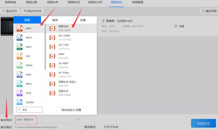 2、对视频需要保存的“输出格式”进行调整。输出格式又分为视频格式和分辨率格式。在输出的视频格式中由于mp4的占用内存相对较小且兼容性相对较高,因此通常把视频格式设置为‘mp4’格式,而视频分辨率一般设置为何原视频相同分辨率的‘同原文件’格式。