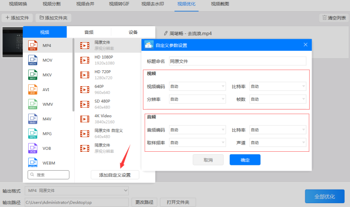 3、如果感觉‘mp4同原文件’格式或软件预设的参数不够用需要自己调整参数的话可以点击“添加自定义设置”针对视频的视频编码、分辨率、比特率、帧数和音频的音频编码、取样频率、比特率、声道参数进行设置以达到使用需求。