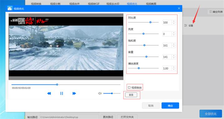 5、点击设置按钮对视频的对比度、亮度、饱和度、音量或播放速度进行调整。还可以勾选倒放按钮提高视频的趣味,如果调整的数值不满意可以重新调整也可以点击“重置”按钮把设置的参数恢复到默认状态。