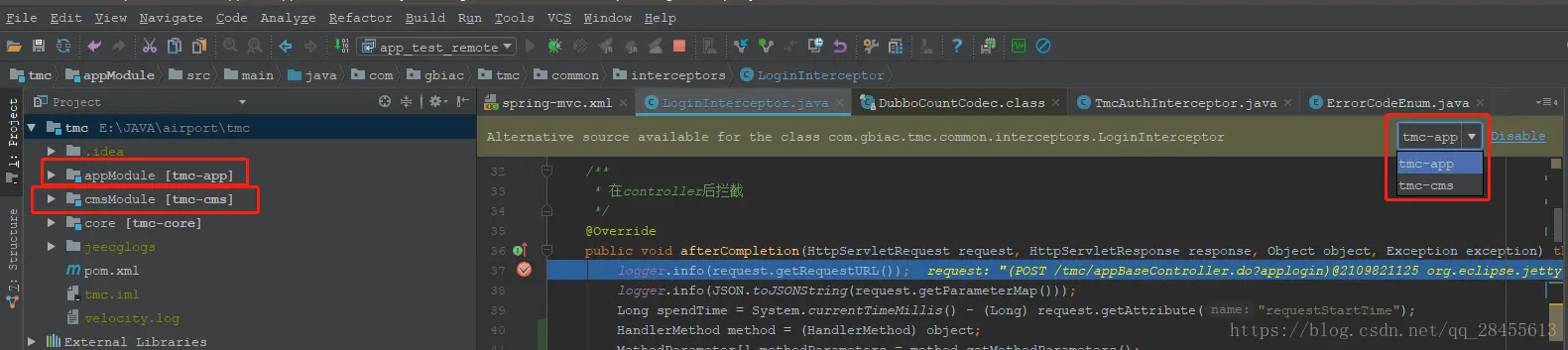 由于项目工程存放了多个应用模块,包括app模块 cms模块,并存在小部分代码相同的情况下,会出现断点跳转至不正确的目标源,此时开启源选择器,即可手动选择,如图: