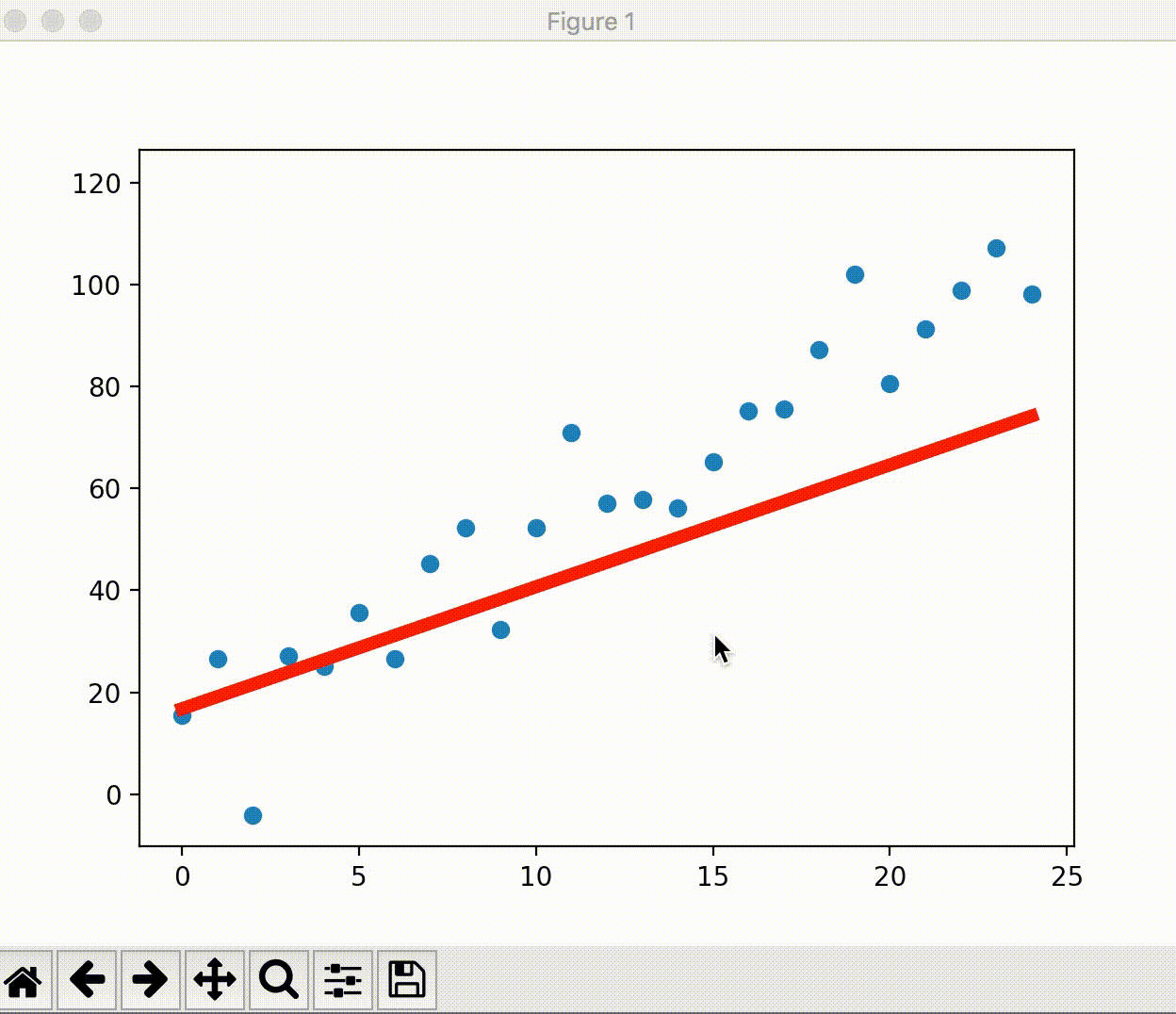 我们通过for循环,训练了10000步模型,并在每100步的时候去更新一下直线。通过运行代码,我们会发现我们的直线会随着模型步数的上升,会慢慢调整,更好的拟合我们的实际值。