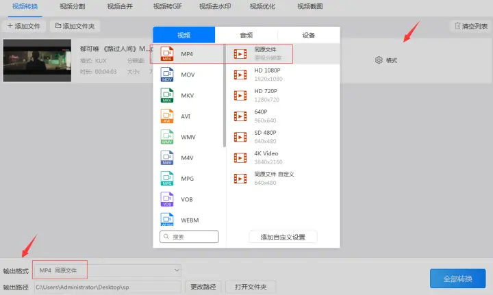 3、把需要转换的kux视频文件都添加到软件后对需要保存的“格式”/“输出格式”进行调整,输出格式又分为输出的视频格式和输出的视频分辨率。因为我们要把kux格式转换成mp4所以我们把视频格式设置为‘mp4’(也可以设置为别的视频格式)。设置分辨率时通常和原视频相同分辨率的‘同原视频’格式。