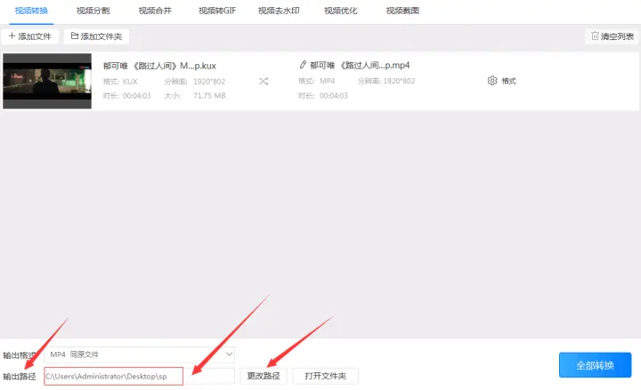 5、以上都调整好后我们可以依次点击软件的“转换”按钮依次转换文件,也可以直接点击软件右下角的“全部转换”按钮统一把kux格式转换成mp4格式。等待片刻软件就会自行把kux格式转换成mp4,最后我们在之前预设的输出路径找到转换后的文件即可。