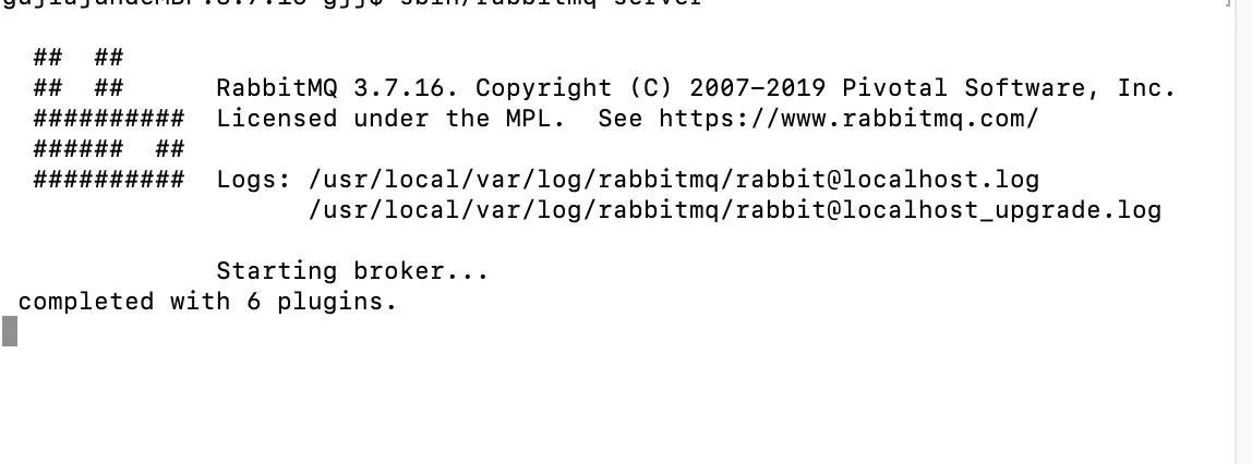 安装成功后,RabbitMQ安装后的路径为:/usr/local/Cellar/rabbitmq/3.7.16 (版本根据安装版本确定)进入该目录(/usr/local/Cellar/rabbitmq/3.7.16)之后,输入sbin/rabbitmq-server指令,出现一下提示信息时rabbitmq启动成功: