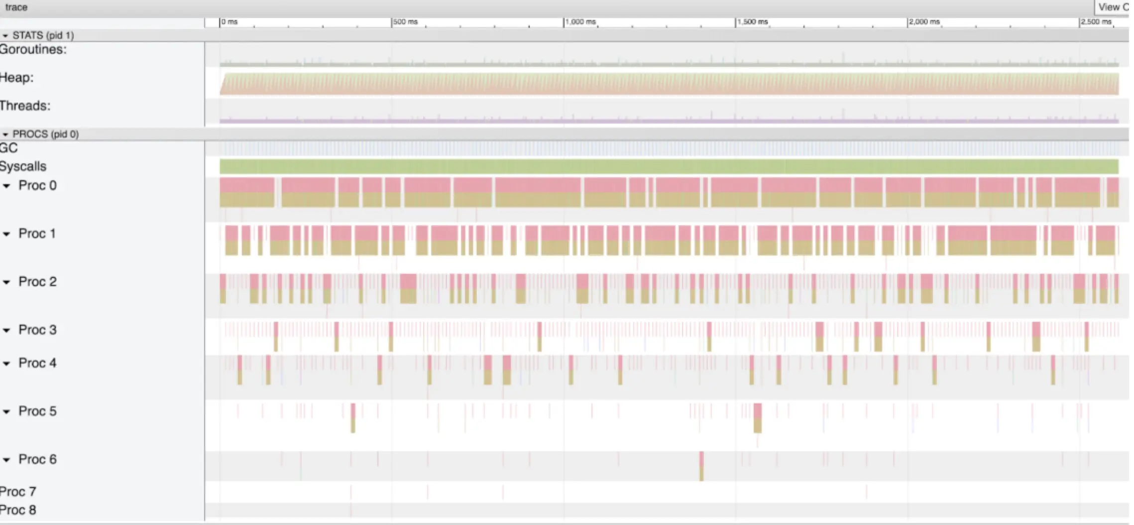 可以看到程序处理4000个文件花费了大约2.5s的时间。如果能够看到gc的实际情况就更好了,你可以使用trace包来生成trace信息。