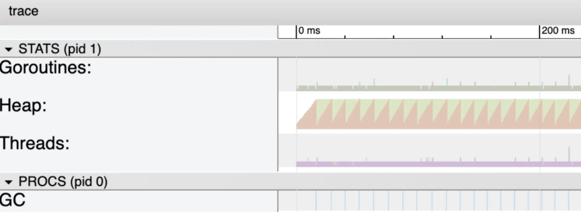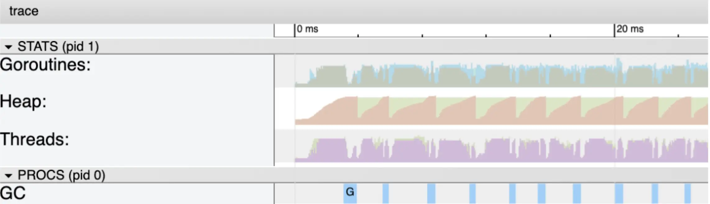 图2是程序运行的trace图。这部分我会主要关注垃圾回收器相关的东西,图中的Heap和GC部分。