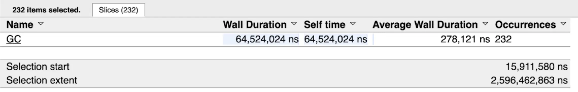 图5中代表了图表中所有蓝线都在标记点15.911ms到2.596s之间。一共发生了232次回收,占用了64.524ms,平均每次回收时间是287.121微秒。了解到程序运行时间是2.626s,也就是说,垃圾回收占用了总时间的2%,基本上垃圾回收的代价对程序运行来说是微不足道的。