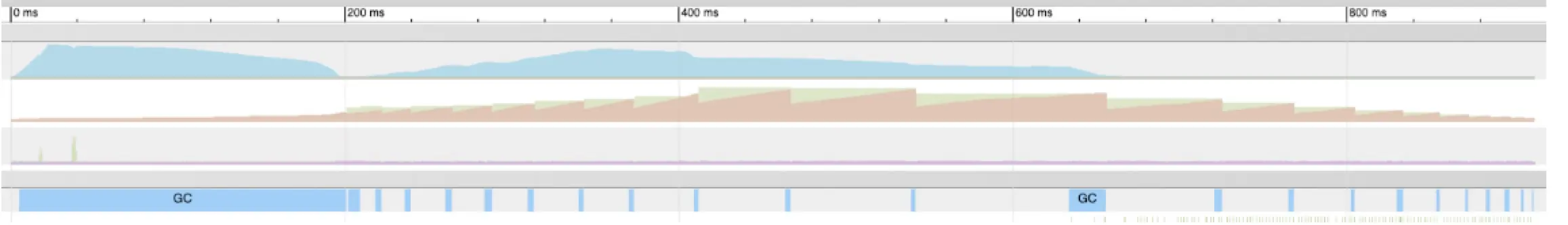 图1.3更近一些去看前200ms的trace信息。注意Heap信息(绿色和橘黄色区域),以及GC(底下蓝色的竖线)。Heap信息告诉了你两件事情。橘色区域是当前时间正在使用的堆空间大小。绿色部分代表,触发下次回收,in-used堆内存空间。也就是说,每次橘色区域达到顶峰的时候,便开始进行垃圾回收。蓝色竖线代表了垃圾回收。
