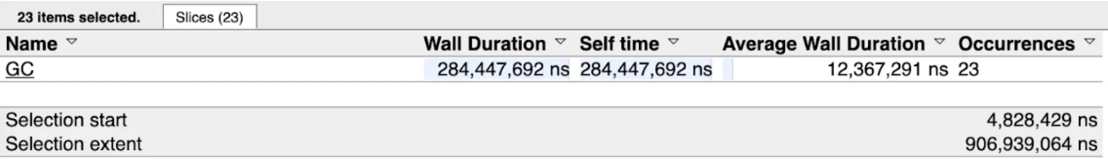 图1.8给出了,从4.828ms到906.939ms内。一共有23次垃圾回收,占用时间284.447ms,平均收集时间为12.367ms。程序运行时间是951ms,这意味着垃圾回收占用了总时间的34%。