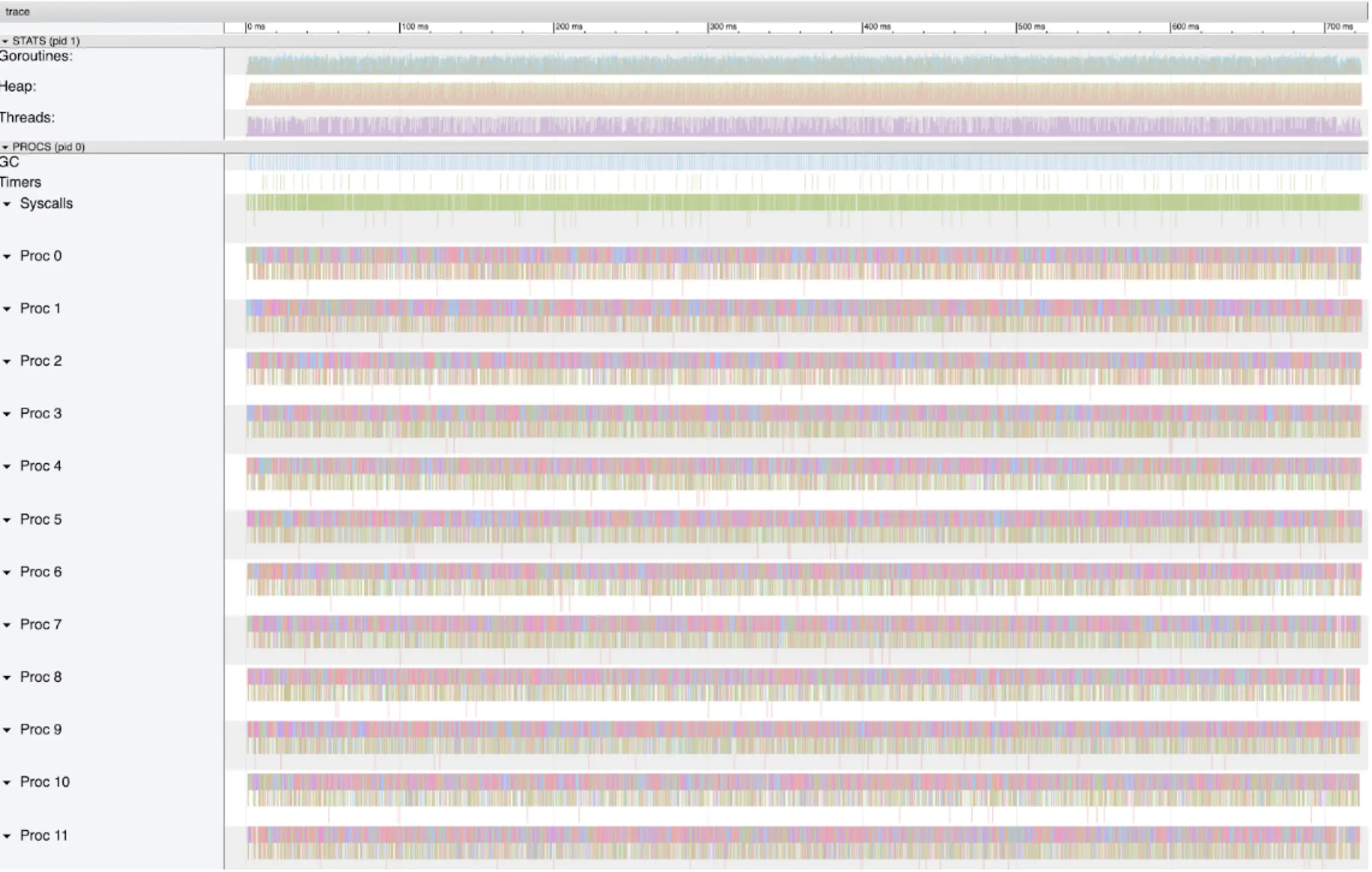 图10给出了前20ms的程序trace图。12个goroutines运行,垃圾回收相对顺序版本时间更长一些。内存使用量维持在4MB之内。