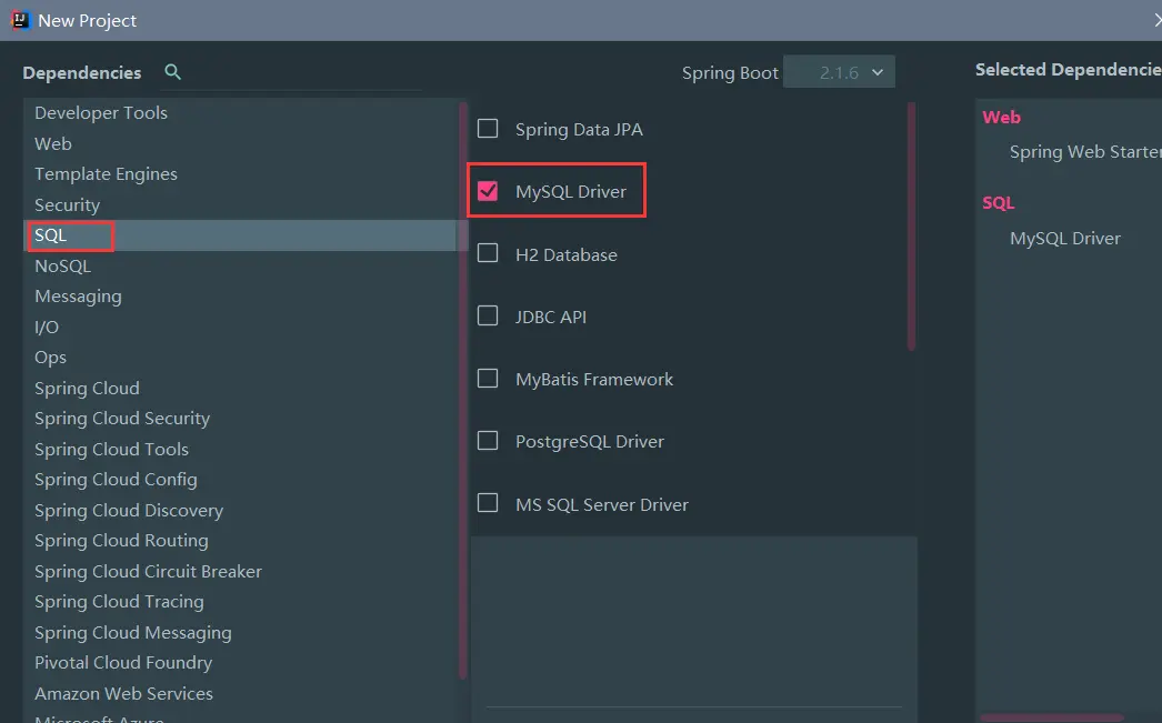 使用 idea 自动化创建Spring Boot项目,这里不再赘述了, 不过需要注意的是, 我们需要把Mysql驱动勾选上: