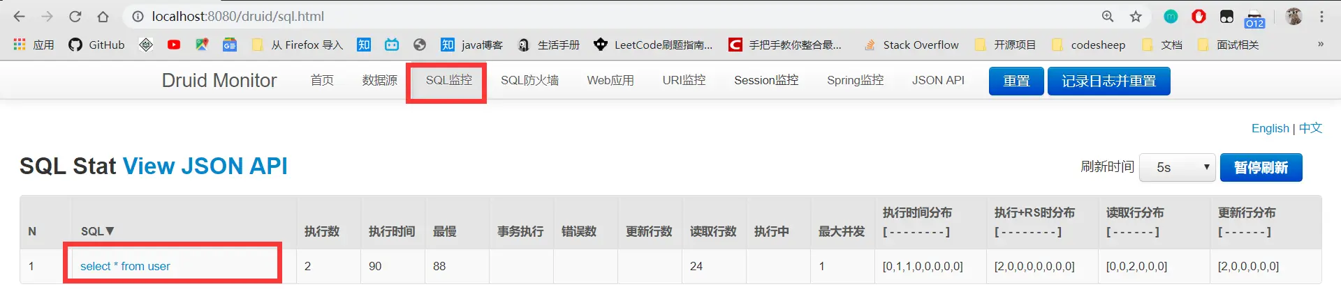 设置好这个,我们可以启动Spring Boot的主类, 然后访问 德鲁伊(Druid)监视器: http://localhost:8080/druid
