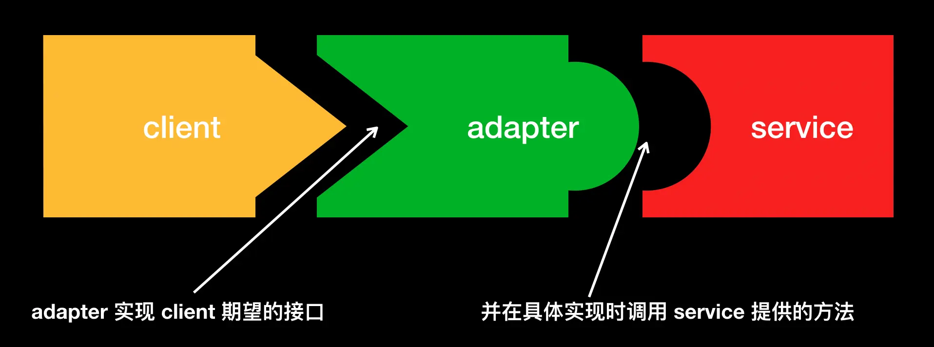 比如我们在做演示的时候经常需要使用一个视频数据线来连接笔记本和投影仪。从笔记本的角度看(作为 client),它只能通过 usb-c 向外输出视频信号,但我们的投影仪(作为 service)的接口是固定的,只接受 HDMI 的信号,无法更改(更改成本比较高)。一个 usb-c to HDMI 的数据线就起到了 adapter 的作用。