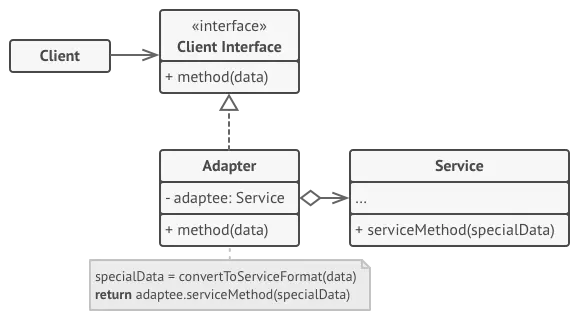 - Adapter 实现了 Client 的接口,内部包含了一个 Service 对象。Adapter 对象通过接口接受 Client 的调用,并将调用转换为 Service 对象能够理解的格式