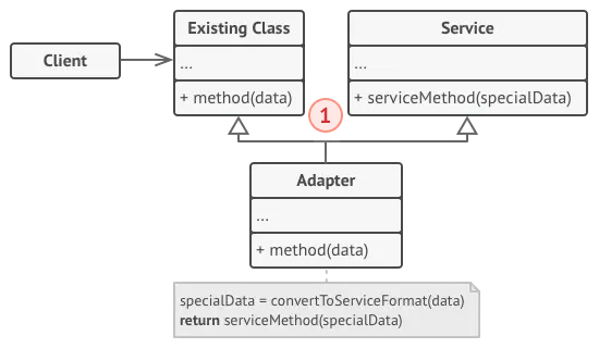 在这种模式下,adapter 不需要 wrap service 对象了,因为它通过继承,既是 client 又是 sercie,在 client 调用的方法中直接调用自己继承的 service 方法就可以了。