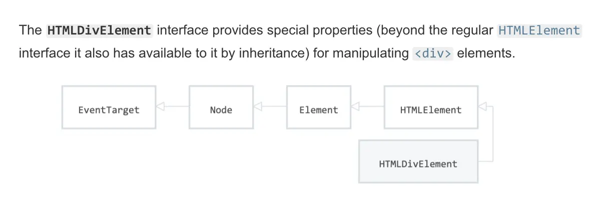 还是以 <div> 为例,我们已经知道它继承自 HTMLElement,其实再往上,HTMLElement 继承自 Element,Element 又继承自 Node,顺着这条路,你可以挖掘出所有 HTML 标签的类型。
