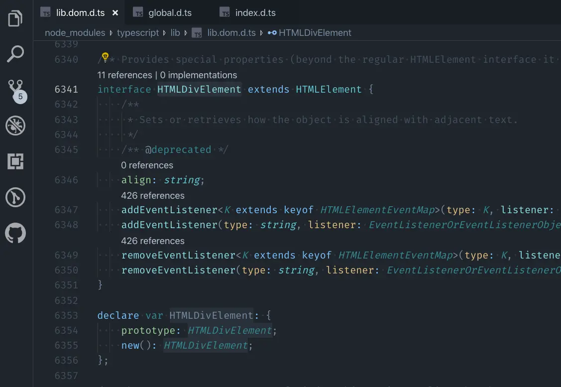 比如下面这张截图,就是对 <div> 标签的类型定义。我们可以看到,它继承了更加通用的 HTMLElement 类型,并且扩展了一个即将被废弃的 align 属性,以及两组 addEventListener 和 removeEventListener,注意这里使用了重载。
