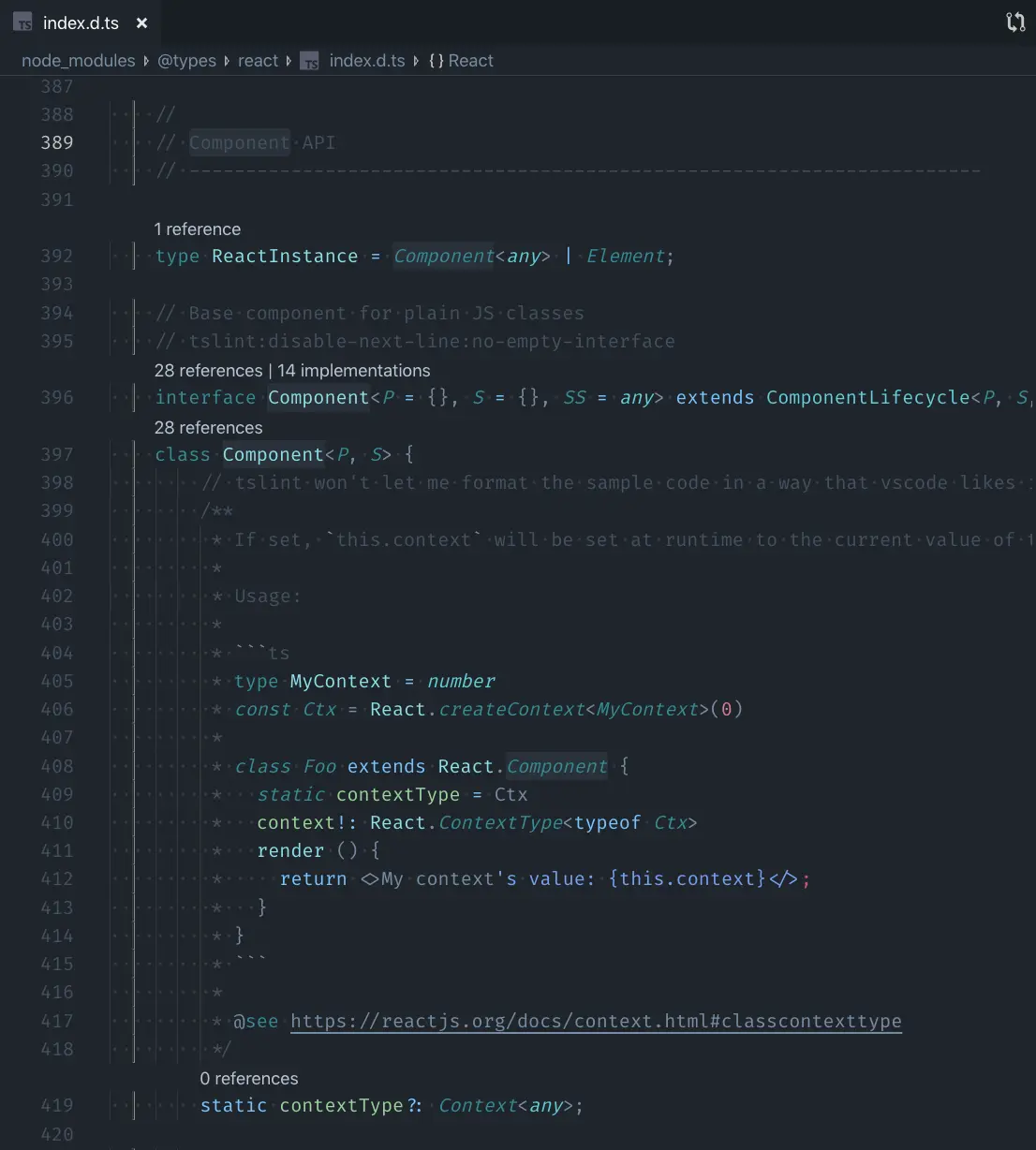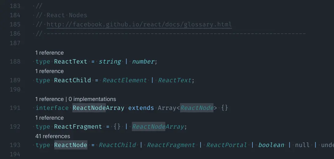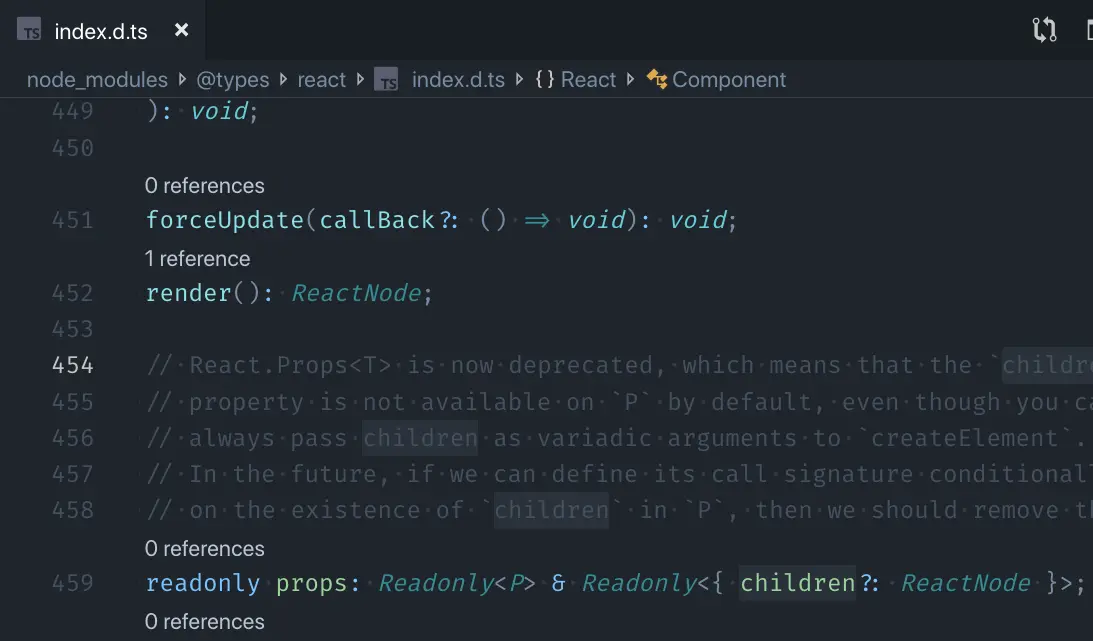最直白的方法就是去看库的 Types Definition,也就是那些 .*d.ts 文件。如果你刚好有在用 VS Code 的话,有一个非常方便的操作:把鼠标移动到你想知道它类型的代码上(比如某个变量、某个函数调用,或是某个 JSX 标签、某个组件的 props),右键选择「Go to Definition」(或者光标选中后按 F12),就可以跳转到它的类型定义文件了。
